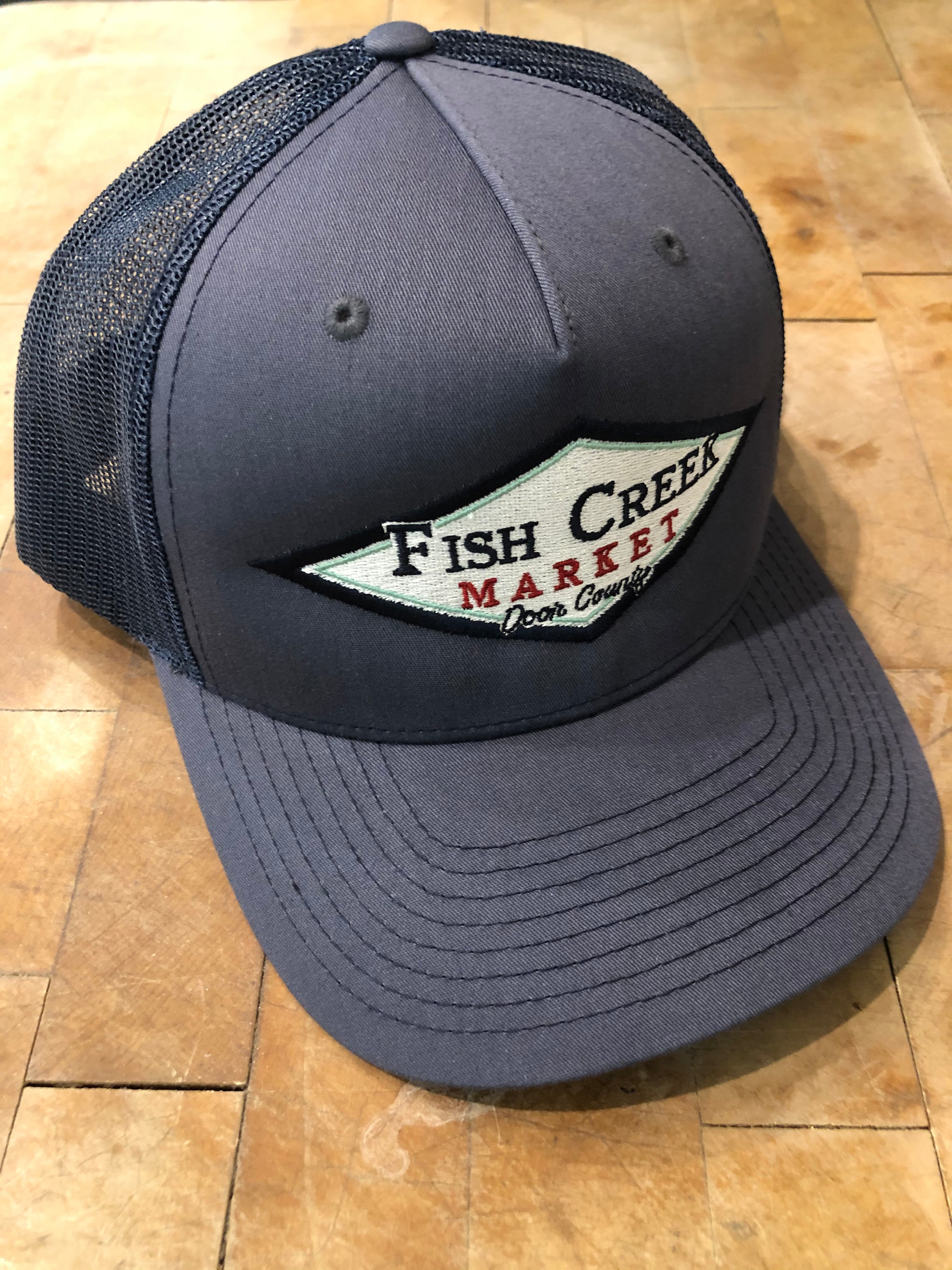 Our signature trucker hat in dark greyish navy with a navy adjustable snap back. Richardson 112 Original Trucker, embroidered locally with Fish Creek Market's diamond logo. One size.